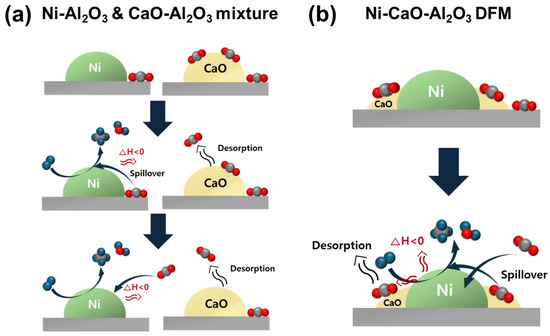 While there have been numerous studies on ICCM utilizing DFM [41,42,43], there have also been many cases where adsorbents and catalysts have been used separately. The adsorbents and catalysts can be loaded into reactors in various configuration such as multi-layer [35], double-layer [44], or physically mixed forms [34]. In these cases, the formation of CH4 has been observed. It is anticipated that the mixture of adsorbents and catalysts will follow a different reaction pathway compared to that which is followed in integrated DFM. The intimate nanoscale interactions, particularly spillover, between the CO2 adsorbent and methanation catalyst in DFM have been shown to enhance methanation efficiency [45,46]. To further develop ICCM process technology, additional studies that focus on spillover phenomena in DFM and reaction conditions are required.