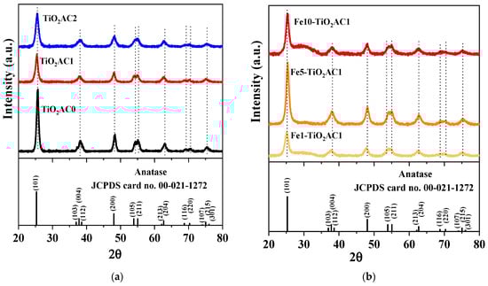 XRD patterns of the (a) TiO2AC and (b) Fex-TiO2AC1 samples.