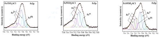 The Fe 2p3/2 envelopes were well-fitted using the multiplets described by Gupta and Sen [,] as a starting point for analyzing high-spin Fe3+ and Fe2+ compounds (Figure 5). Except for Fe10-TiO2AC1, all iron-containing samples exhibited a Fe 2p3/2 structure. This structure consists of a low-intensity peak on the lower binding energy side of the envelope, followed by a peak associated with the presence of metallic Fe(0) []. The formation of reduced iron species can be the result of its strong interaction with TiO2 support (SMSI) [], facilitated, in this case, by the presence of carbon in the thermal treatment. The main part of the structure is formed by Fe2+ 2p3/2 multiplets corresponding to the FeO phase [,]. To fully describe the entire envelope, a peak associated with the surface structures was also introduced at the higher binding energy side. The Fe 2p3/2 envelope is larger and richer in the case of the Fe10-TiO2AC1 sample. The Fe2+ multiplets remain the most intense, while the higher binding energy side of the structure is well-fitted by introducing the Fe3+ multiplets. Their presence indicates the formation of the Fe2O3 phase.
