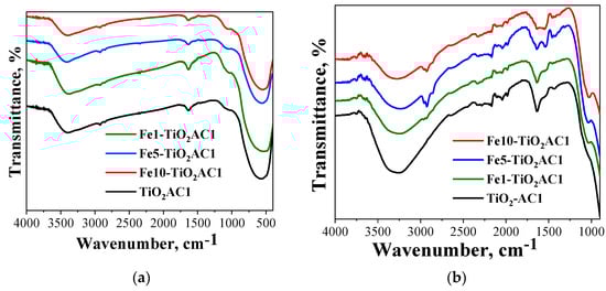The recorded ATR-FTIR spectra of nanocomposites are also presented in Figure 6b. The band centered at around 3250 cm−1 can be related to the superposition of the vibration band of the hydroxyl group and the stretching vibration of the adsorbed water molecule. As the amount of Fe increases, the band maximum shifts towards higher frequencies. This shift may be attributed to stronger hydrogen bonding interactions that occur upon the formation of the nanocomposites. The peaks observed at 2960 cm−1 and 2925 cm−1 are mainly due to the stretching vibration of the C=O bond. The bands between 2500 and 2300 cm−1 correspond to the stretching of C-O bonds and the peak at 1643 cm−1 is associated with the stretching and bending vibrations of the -OH groups. These functional groups are believed to influence phase formation and stabilization in all the nanocomposites []. In the Fex-TiO2AC1 samples, the peaks at 1454 cm−1 and 1423 cm−1 are assigned to the vibration of the TiO2 lattice in the presence of AC and Fe. All Fex-TiO2AC samples display increased absorption around 1034 cm−1, which is attributed to the Fe-O-Ti stretching vibrations [,]. Although this band is very low in intensity, its amplitude increases in line with the iron concentration in the nanocomposites.