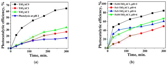The efficiency of CR removal without the catalyst, and in the presence of TiO2AC (a) and Fex-TiO2AC photocatalysts (b) under visible irradiation and pH = 6, except Fe10-TiO2AC1, for which the reaction was also carried out at pH = 2.