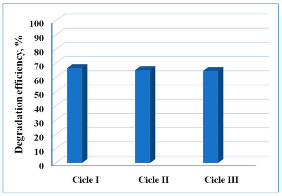 The reusability of a photocatalyst is an important characteristic for practical applications. To determine the recyclability of the Fe10-TiO2AC sample (with the highest photodegradation efficiency and mineralization grade), the reaction for the photodegradation of CR was repeated up to three times. Each cycle was performed at a pH of 6 for 300 min. After each cycle, the Fe10-TiO2AC1 sample was separated by centrifugation, washed with distilled water, dried overnight at 70 °C, and then used for the next reaction cycle.