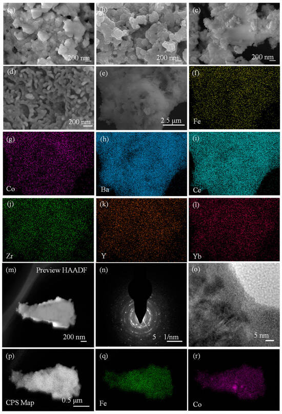 SEM images and EDS mapping of reduced bimetallic catalysts: (a) Fe3Co/BZCYYb; (b) FeCo/BZCYYb; (c) FeCo3/BZCYYb; (d) BZCYYb; (e) electron image of FeCo/BZCYYb; (f) Fe; (g) Co; (h) Ba; (i) Ce; (j) Zr; (k) Y; (l) Yb. HRTEM images of FeCo/BZCYYb: (m–o). CPS mapping of FeCo/BZCYYb: (p). EDS mapping images: (q) Fe; (r) Co.