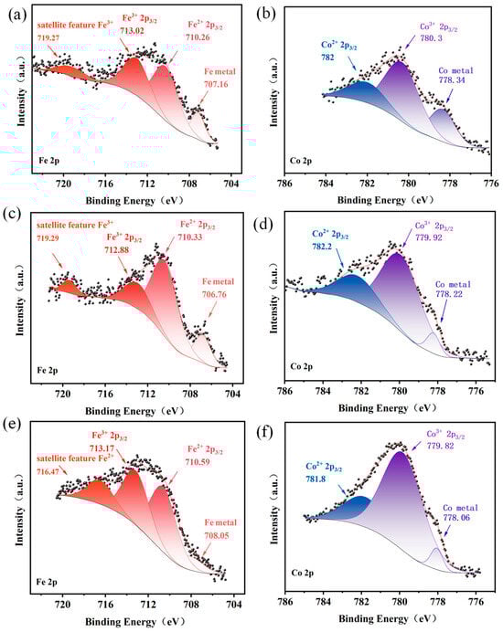 High-resolution XPS spectra of Fe 2p and Co 2p of bimetallic catalysts: (a,b) Fe3Co; (c,d) FeCo; (e,f) FeCo3.