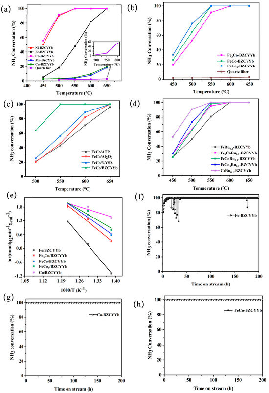 Ammonia decomposition activity of (a) monometallic catalysts of Fe, Co, Ni, Mn, and Cu; (b) bimetallic catalysts of different rations of FemCon supported on BZCYYb; (c) FeCo active metals loaded onto different supports; (d) different rations of FemCon with 0.1 wt.% Ru trimetallic catalysts supported on BZCYYb; and (e) the relationship between the ammonia decomposition rate of monometallic and bimetallic catalysts and the reaction temperature. The stability of catalysts for ammonia conversation at 600 °C with a GHSV of 6000 L Kg−1h−1: (f) Fe/BZCYYb; (g) Co/BZCYYb; and (h) FeCo/BZCYYb.