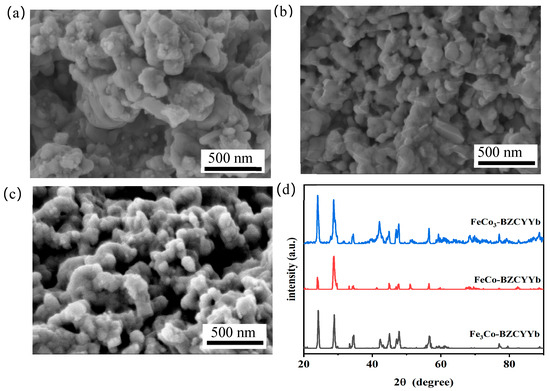 SEM images of bimetallic catalysts after ammonia decomposition tests: (a) Fe3Co/BZCYYb, (b) FeCo/BZCYYb, and (c) FeCo3/BZCYYb; (d) XRD pattern of bimetallic catalysts after ammonia decomposition tests.