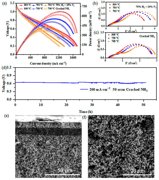 (a) Cell voltage and electrochemical performance of SOFCs operating with 75% H2 + 25% N2 and cracked NH3 at various temperatures; (b,c) impedance spectra of SOFCs with 75% H2 + 25% N2 and cracked NH3 at various temperatures, respectively; (d) short-term stability of SOFCs fed with cracked NH3 operated at 700 °C and 200 mA cm−2. SEM images of cells after a 50 h stability test with cracked NH3: (e) cross-section of the cells, (f) anode surface of the cells.