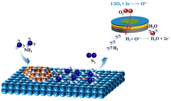Based on the above analysis, the mechanism of FeCo catalysts facilitating ammonia decomposition reaction is summarized in Figure 7. NH3 is initially adsorbed onto the active site of the metal catalyst, and the N-H bond is then broken and dehydrogenated to form metal–N compounds and adsorbed H species. As the H atoms continue to fall off, the adsorbed N atoms and H atoms finally recombine to form N2 and H2, whereas the electron transfer from the d-band of Co to Fe facilitates the desorption of the adsorbed N atoms on the surface and reduces the reaction barrier to increase the catalytic activity for the decomposition of ammonia [5,6,8]. The H2 generated from the ammonia decomposition is passed into the anode of SOFCs, through the anode gas channel. Upon contact with the active surface of the three-phase interface, the O2 at the cathode flows through the cathode channel, is adsorbed onto the surface of the cathode with catalytic reduction, and is then reduced to O2-, which migrates to the anode through the electrolyte membrane to react with H2 to generate H2O and electrons.