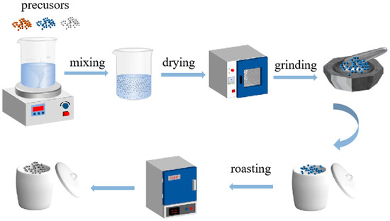 The BZCYYb support, prepared using the sol–gel method (Ruier Powder Materials Corporation, Huizhou, China), was sintered at 1000 °C for 2 h to eliminate volatiles and enhance its thermal stability. Fe(NO3)3·9H2O (Macklin Company, Shanghai, China), Co(NO3)2·6H2O (Aladdin Company, Shanghai, China), Ni(NO3)2·6H2O (Hushi Company, Shanghai, China), Cu(NO3)2·3H2O (Aladdin Company), Mn(NO3)2·4H2O (Aladdin Company), and RuCl3 xH2O (Aladdin Company) were used as metal precursors, which were impregnated into BZCYYb via the wet impregnation method; the catalyst preparation process is shown in Figure 8. The amounts of different metal precursors, including both non-precious metals and Ru used as control tests, and their designed loading contents are summarized in Table 2. In this study, we used Fe-decorated BZCYYb as an example to illustrate the process. Initially, Fe(NO3)3·9H2O of an amount corresponding to 0.1 g of Fe and 0.9 g of BZCYYb were dissolved in anhydrous ethanol separately and stirred to form a homogeneous solution and suspension, respectively, and then the two were mixed together to form a mixture. The mixture was subjected to 30 min of ultrasonic treatment to achieve uniform metal dispersion on the support, followed by stirring in a fume hood until the ethanol completely evaporated. The resulting powder was then dried in an oven at 85 °C for 24 h and calcined at 600 °C for 2 h. Subsequently, it was reduced in situ at 600 °C for 3 h.