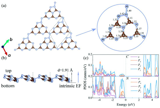 Relaxation atomic structure of C3N5 monolayer (top view (a) and side view (b)): nitrogen and carbon atoms are represented by blue and brown spheres, respectively, with the circles indicating the atoms and corresponding bond lengths (Å) in the crystal cell; (c) the projected density of states of single-layer atomic orbitals [26].