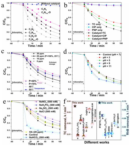 (a) Pressure degradation performance of the prepared catalyst. (b) Degradation curves for different refractory pollutants. (c) TC degradation curves under various conditions such as dosage, power, and temperature are presented. (d) Degradation curve for 20 parts per million at different pH values of C3N5−x-O is illustrated. (e) Degradation curves of 20 parts. (f) Comparative analysis of kinetic constants between this study and other literature is conducted [20].