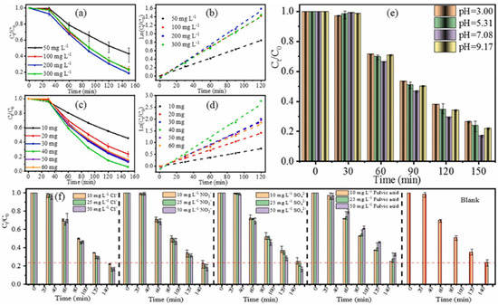 The influences on degradation, including (a) SPC concentration, (b) U-C3N5 dosage, (c) initial pH of SMZ solution, (e) anions, and fulvic acid, (d,f) SPC concentration and U-C3N5 dosage. Test bar Piece: CMZ, initial 10 mg/L, T = 250.5 °C, visible light [33].
