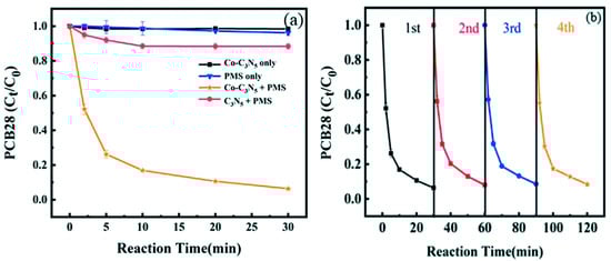 Co-C3N5 activates PMS for PCB28 degradation: (a) degrade kinetics, (b) the catalytic ability of Co-C3N5 to PCB28 after four cycles [24].
