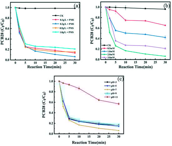 The effects of Co CsNs loading (a) PMS concentration, (b) and initial reaction pH, (c) on the degradation of PCB28 by Co CsNs/PMS. Reaction Conditions: [Co CsNs = 1.0 g/L, [PCB28] = 0.5 mg/L, [PMS] = 0.5–3.0 mM, pH = 3.0–1.0 (buffer solution) [24].