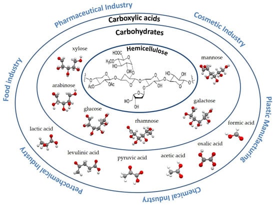Furthermore, hemicelluloses can be transformed into high-value chemicals, including furfural and xylitol, as well as other renewable bioproducts that serve as alternatives to petroleum-based chemicals. The conversion of hemicelluloses into these products contributes to the economic viability and sustainability of lignocellulosic biomass processing, supporting the circular bioeconomy by reducing waste and enabling the production of renewable resources [,,].