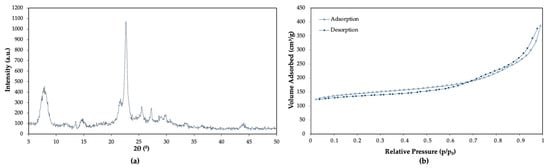 Results from XRD analysis (a) and adsorption and desorption isotherms (b) for the H-BEA material.