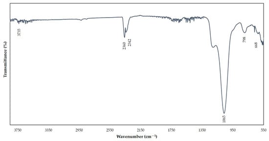 Figure 3 below shows the results from the ATR FT-IR analysis for the H-BEA sample. Based on the analysis, a small band can be observed at 3735 cm−1, which, according to the literature, can be attributed to stretching vibrations of the -OH group []. In the case of the band at 1065 cm−1, it is characteristic of asymmetric stretching vibrations assigned to the tetraeric forms of SiO4 and AlO4, which are the building blocks for zeolite. However, the band at 798 cm−1 can be assigned to symmetric stretching vibrations for SiO4 and AlO4 []. Additionally, two unresolved bands were also observed in the range of 2360–2342 cm−1, which comes from the presence of the -CO group coming from carbon dioxide [], which could have been absorbed from the air because the analysis was not performed in a vacuum.