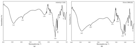 FT-IR analysis was performed for the ion exchange resin called Dowex DR8G(H) (Figure 4b). Characteristic bands corresponding to the presence of groups and a benzene ring were observed, which confirms the structure of this material. First, a broad band can be observed at a wavelength of 3409 cm−1, which comes from the stretching vibrations of the -OH group. The weak band at 2925 cm−1 belongs to asymmetric stretching vibrations belonging to C-H bonds related to the cross-linked polystyrene skeleton, which is the building block of the ion exchange resin. A band at 1414 cm−1 was also observed, which was assigned to the stretching, asymmetric vibrations of the methylene group -CH. In turn, the band at 829 cm−1 comes from 1,4-disubstituted benzene rings present in the styrene-divinylbenzene skeleton. In turn, a small band at 1128 cm−1 can be assigned to symmetric stretching vibrations belonging to the -SO3 group. The absence of a band at 1035 cm−1 and the appearance of a band at 1000–1008 cm−1 may be related to the appearance of Brønsted centers in the form of H+ ions [].