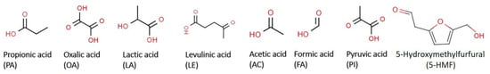5-HMF—5-hydroxymethylfurfural, OA—oxalic acid, LA—lactic acid, FA—formic acid, LE—levulinic acid, AC—acetic acid, PI—pyruvic acid.