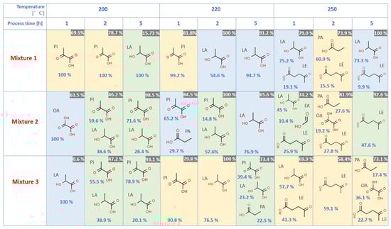 Figure 6 shows a matrix with optimal process parameters for the production of oxalic, lactic and levulinic acids as a function of temperature, process time and catalyst. The results are summarized in Table 4, Table 5, Table 6, Table 7, Table 8, Table 9, Table 10, Table 11 and Table 12.