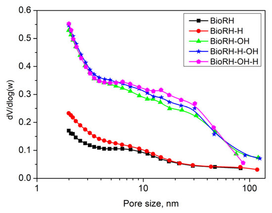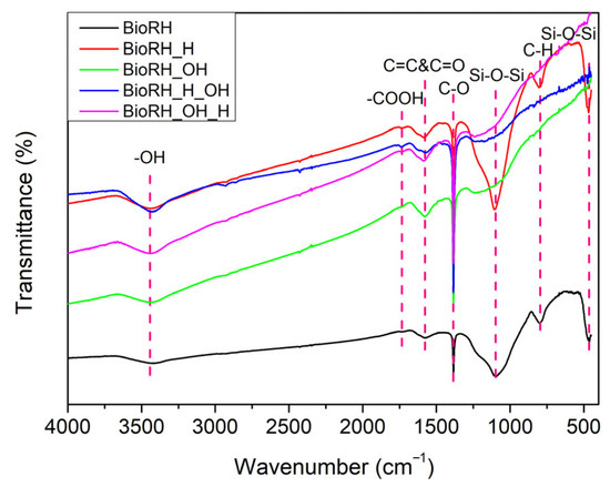 FTIR spectra were used to determine the functional groups of the parent biochar and the post-treatment-derived samples. Figure 4 shows that in all FTIR spectra, seven absorption peaks can be observed [32]. The peak appearing in the range 3600–3300 cm−1 is attributed to O–H stretching of alcoholic and phenolic hydroxyl groups. The intensity of this band increases in the spectra of post-treated samples, indicating that the hydrothermal treatment of BioRH adds hydroxyl groups on their surfaces. The peak at about 1700 cm−1 is attributed to C=O stretching of the –COOH group. The peak at ~1600 cm−1 corresponds to C=C and C=O stretching bands for conjugated aromatic rings. The peak appearing at 1400 cm−1 suggests the existence of O–H and C–O groups of phenol. The peaks at 1084 cm−1 and 460 cm−1, appearing only in the spectra of BioRH and BioRH-H samples, are attributed to the Si–O–Si stretching band. The latter peaks have almost vanished in the spectra of alkali-treated biochar samples. This indicates that extended desilication takes place upon such a treatment. Finally, the band at 800 cm−1, attributed to C-H stretching, disappears from the spectra of alkali-treated biochar samples (BioRH-OH, BioRH-H-OH, and BioRH-OH-H), probably due to extended delignification caused by alkali treatment, in accordance with the XRD results.