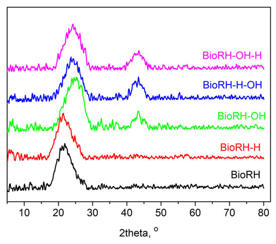 The acidic post-treatment leaves the crystal structure of BioRH unaffected. On the other hand, alkali post-treatment reduces the SiO2 content and, of course, the intensity of the corresponding peak. This results in a shift in the peak overlapping the two aforementioned peaks towards higher 2theta values. A new peak rising at 43.8° after alkaline treatment indicates that the graphite phase is predominant in the corresponding samples [30]. The high graphitization degree of the alkali post-treated samples is also an indication that residual lignin phase components are removed [31].