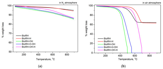 In order to examine the thermal stability of the biochar samples prepared, TGA studies were performed under inert and air atmosphere. Figure 5a shows the TGA curves obtained under N2. The samples subjected to alkali treatment seem to be more sensitive to gasification than the parent and acidic-treated ones (BioRH and BioRH-H). This could be explained by considering that the latter samples are rich in silica, which is stable under the temperatures studied. Figure 5b shows the TGA curves of biochar samples studied in air atmosphere. The weight loss of BioRH and BioRH-H samples does not exceed 35%, indicating that their silica percentage is equal to 65% and the acid post-treatment does not affect the SiO2 content. In contrast, a complete burning of alkali-treated biochar samples is observed, verifying that this treatment leads to complete desilication, in accordance with the XRD and FTIR results presented above. However, Figure 5b reveals that the sequence of post-treatments affects the resistance of biochar samples to combustion.