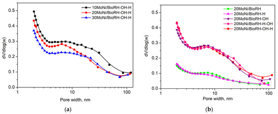 Pore size distribution curves: (a) 10, 20, and 30NiMo/BioRH-OH-H catalysts; (b) 20MoNi/BioRH-X-Y catalysts.