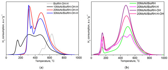 H2-TPR profiles of the calcined samples at 400 °C under Ar flow: (a) 10, 20, and 30NiMo/BioRH-OH-H; (b) 20MoNi/BioRH-X-Y.