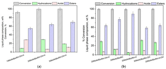The catalysts prepared using BioRH-OH-H as support were evaluated for upgrading of UCO towards green diesel, via SDO in a semi-batch high pressure reactor, working at 310 °C, 40 bar pressure, 100 mL/min H2 flow rate, and 1000 rpm, and loaded with 100 mL of UCO and 1 g of catalyst. UCO is a difficult feedstock, as it consists mainly of triglycerides and their fry-derivatives (di-, monoglycerides, free fatty acids (FFAs), and polymerization products), and contains small quantities of water, polysaccharides, and proteins coming from cooked foods [7]. The conversion of UCO and the composition of liquid product obtained after 9 h of reaction are presented in Figure 10a. Inspection of this figure shows that the catalyst with 10 wt.% metal loading achieved a UCO conversion higher than 90%, resulting in 9% n-hydrocarbons in the diesel range (C15-C18). Comparing these values with those obtained previously (conversion 70% and hydrocarbons yield 2%) [10] using the same support loaded with 10 wt.% Ni, the promoting action of Mo addition is manifested one more time [5]. By increasing the MoNi loading to 20 wt.%, complete conversion of UCO was achieved and the hydrocarbon yield almost tripled, reaching 29 wt.% in the liquid product. The further increase in MoNi loading to 30 wt.%, although resulting in complete UCO conversion, resulted in a decrease in the hydrocarbon yield (19 wt.% in liquid product). It should be noted that under the experimental conditions adopted for catalyst evaluation, a too-low concentration of cracking products (<1 wt.% in the liquid phase) was obtained.