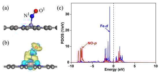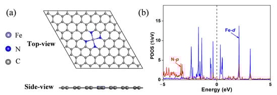 The stability of a catalyst is very important to maintain its catalytic activity. The strong interaction between the Fe atom and NG could also ensure the high stability of Fe-NG. The interaction between the Fe atom and NG was evaluated by calculating the binding energy (BE) and the formation energy (Ef) of Fe-NG. The BE of an Fe atom on NG is −10.05 eV, as shown in Table S1. The Ef of Fe-NG is 1.44 eV (Table S1), which is in agreement with the reported results []. These results suggest the high thermodynamic stability of Fe-NG. The projected density of states (PDOSs) of Fe-NG was also calculated to obtain further insights into its good stability, as shown in Figure 1b. The d orbital of an Fe atom strongly overlaps with the 2p orbital of an N atom near the Fermi level, indicating the strong interaction between the Fe and the N atom.