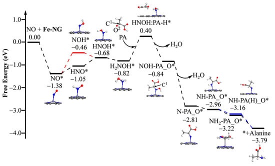 Gibbs energy profiles of alanine formation by hydrogenation of NO molecule on Fe-NG. * denotes that the NO reduction intermediates are adsorbed on Fe-NG.
