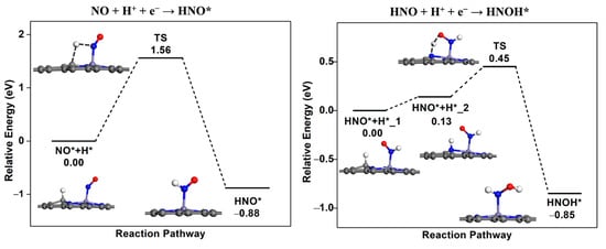 According to the above discussion, the N_e structure of NO adsorption was selected for the subsequent reaction calculations. The reaction pathways of NO reduction (NOR) are divided into three potential routes: HNO*, NOH*, and N* + O*. As both the N and O atoms of the adsorbed NO are possible sites to accept the first proton and electron, and formed HNO* and NOH* two different species. Also, the absorbed NO can undergo the dissociation of the N–O bond to N* + O*. The ∆G values for the formation of the HNO*, NOH*, and N* + O* species are 0.33, 0.92, and 4.12 eV, respectively (Figure 3). The N* + O* pathway is first excluded due to its high ∆G value. Further hydrogenation of the HNO* and NOH* intermediates is discussed in the following section.