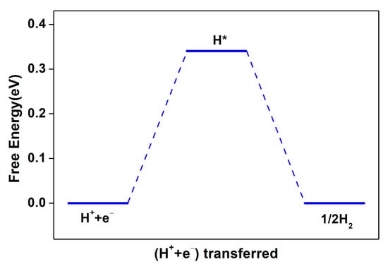 The adsorption of hydrogen atoms on the catalyst surface was calculated to evaluate HER activity on Fe-NG. The ΔG value for the HER on Fe-NG is 0.34 eV (Figure 6). The Ulim value for the HER on Fe-NG is −0.34 V, which is comparable to the Ulim value for the formation of alanine (−0.37 V). This indicates that hydrogen formation is inevitable during the alanine process of alanine formation, which is consistent with the experimental results []. In addition, choosing the appropriate electrolyte or modifying the electrode is a feasible method to inhibit the effect of the HER.
