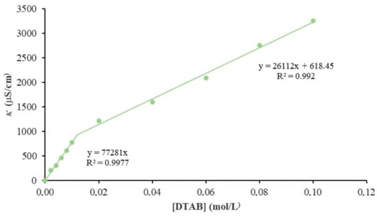 The self-assembly behavior of the commercial dodecyltrimethylammonium bromide (DTAB) (in the absence of nucleic acids) was studied by conductometry, as shown in Figure 1, allowing for the determination of the CMC. The critical micellar concentration (CMC) can be determined from the break in conductivity versus surfactant concentration plots, which is characteristic of micelle formation [].