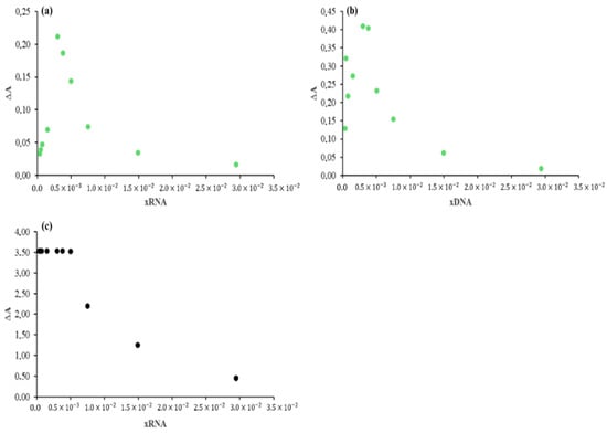 Job plot showing absorbance (at 260 nm) variation with: the RNA molar fraction, for DTAB (a), the DNA molar fraction, for DTAB (b), and the RNA molar fraction, for (C12Cys)2(Q) (c).