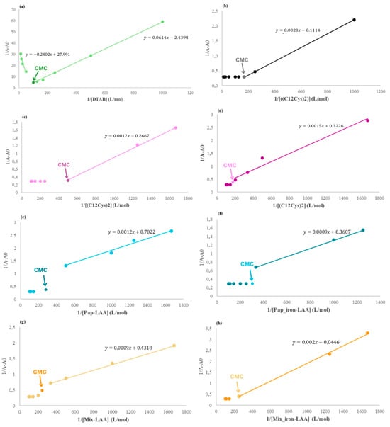 The same Benesi–Hildebrand mode analysis was used to analyze pre-CMC and post-CMC behaviors (Figure 4). As seen in Figure 5, every surfactant presented a linear slope for the pre-CMC assays.