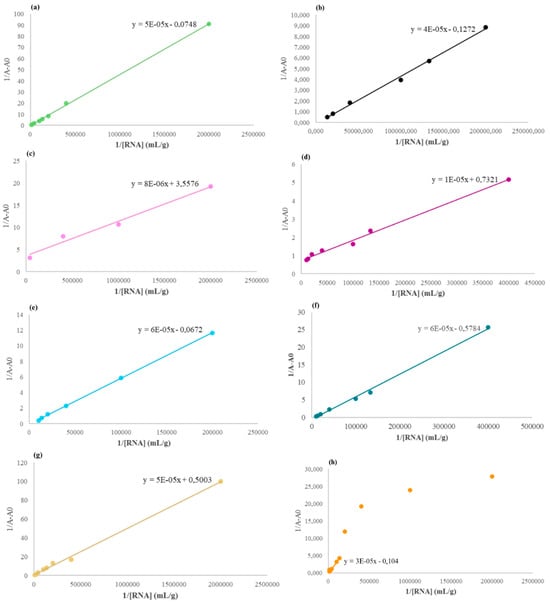 Benesi–Hildebrand model applied to varying concentrations of RNA and pre-CMC LAA concentration: DTAB, , , , Pap-LAA, Pap_iron-LAA, Mix-LAA, and Mix_iron-LAA correspond to (a), (b), (c), (d), (e), (f), (g), and (h), respectively.