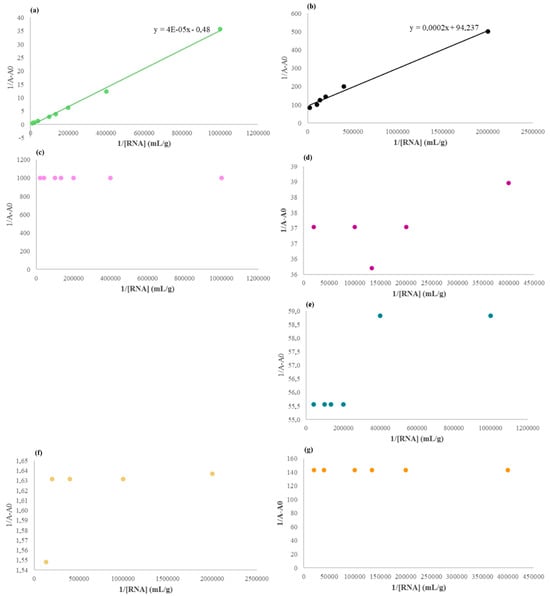 Benesi–Hildebrand model applied to varying concentrations of RNA and post-CMC LAA concentration: DTAB, , , , Pap_iron-LAA, Mix-LAA, and Mix_iron-LAA correspond to (a), (b), (c), (d), (e), (f) and (g), respectively.