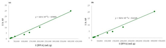 Thus, it was possible to analyze the binding behavior between the surfactant and RNA/DNA by plotting against the inverse of surfactant concentration, . The ratio of the intercept and the slope corresponds to the binding constant, Kapp []. The higher the value of the said ratio, the higher the value of the binding constant—a 1:1 complex formation between each binding site of nucleic acid and surfactant [].