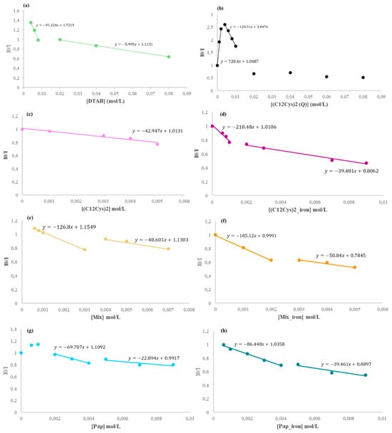 Stern–Volmer model applied to samples with varying concentrations of LAAs and constant RNA and EtBr concentrations: DTAB, , , , Pap-LAA, Pap_iron-LAA, Mix-LAA, and Mix_iron-LAA correspond to (a), (b), (c), (d), (e), (f), (g), and (h), respectively.