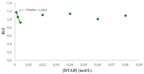 Since the used surfactants were cationic, an increase in fluorescence intensity was expected due to the formation of the charge-transfer complex mentioned previously []. As seen in Figure 8, the opposite was observed.