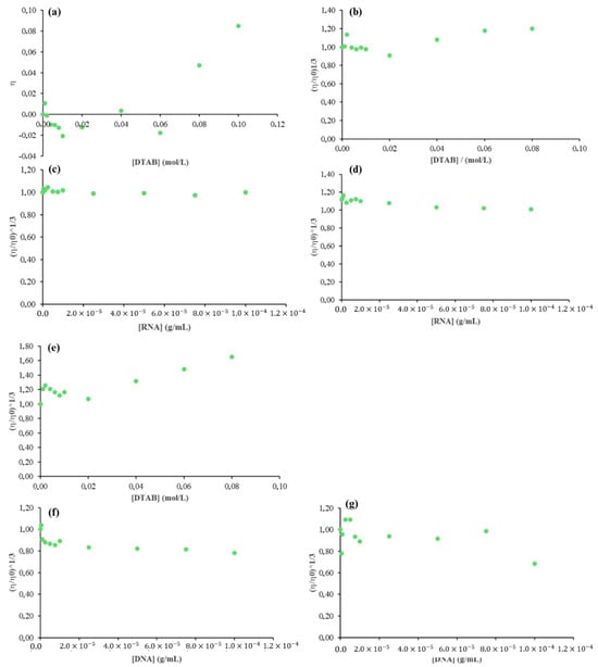 Viscosity assay in the presence of DNA, RNA and DTAB: pure DTAB (a), RNA with varying DTAB concentrations (b), varying RNA concentrations with a DTAB concentration pre- and post-CMC (c) and (d), respectively, DNA with varying DTAB concentrations (e), and varying DNA concentrations with a DTAB concentration pre- and post-CMC (f) and (g), respectively.