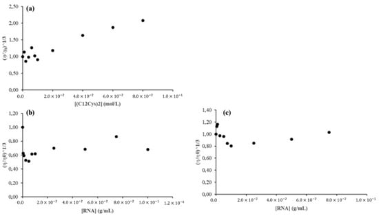 Viscosity assay in the presence of RNA and : RNA with varying concentrations (a) and varying RNA concentrations with a DTAB concentration pre- and post-CMC (b) and (c), respectively.