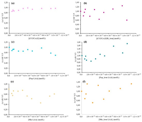 Viscosity assay in the presence of RNA and various synthetized LAA: RNA with varying concentrations (a), RNA with varying (b), RNA with varying Pap-LAA concentrations (c), RNA with varying Pap_iron-LAA concentrations (d), RNA with varying Mix-LAA concentrations (e), and RNA with varying Mix_iron-LAA concentrations (f).