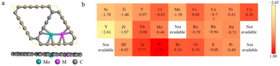 In contrast to other NC substrates that fix metal atoms with defects, such as N-doped graphene, GDY can provide anchoring sites with intrinsic cavity structures. A range of possible anchoring sites in the cavity of GDY have been investigated with DFT. The most stable anchoring site is illustrated in Figure 1a, aligning with previous calculations [24]. The model catalysts MoM-GDYs (M is Sc, Ti, V, Cr, Mn, Fe, Co, Ni, Cu, Y, Zr, Nb, Mo, Ru, Rh, Pd, Hf, Ta, W, Re, Os, Ir, Pt) are constructed based on this configuration. The lattice constants were optimized and shown in Table S1, while configurations are shown in Figure S1. Considering that metal atoms are prone to aggregation due to the high surface energy and mobility on the substrate, the thermodynamic stability of these structures is evaluated by comparing the binding energy (Eb) and cohesive energy (Ec) [25,26,27]: