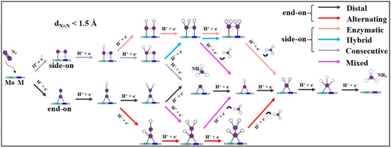 Mechanistically, eNRR is regarded to proceed along distal, alternating, enzymatic, or hybrid mechanisms [31,32]. However, the hybridization of these four paths was also reported with enhanced catalytic activities, which originated from synergistic effects [33,34,35]. Thus, considerable intermediate states and binding configurations should be investigated to identify the reaction paths. Our calculations are structured in Figure 3. As shown, the calculations started from two scenarios: end-on N2 adsorption and side-on N2 adsorption.