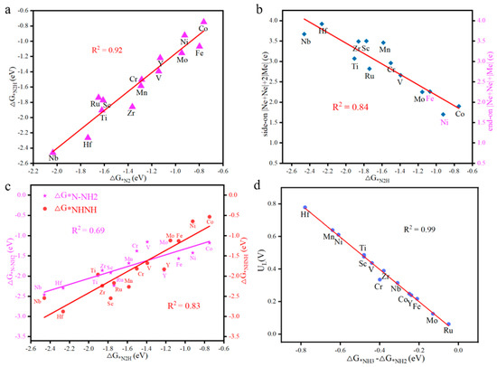 The scaling relationships for (a) ΔG*N2 vs. ΔG*N2H, (b) configurations of N2 end-on adsorption: ΔG*N2H vs. |Ne + Ne| + |Me|, configurations of N2 end-on adsorption: ΔG*N2H vs. |Ne + Ne| + 2|Me| (Ne is the amount of charge transferred by the N atom and Me is the amount of charge transferred by the metal atom M), (c) ΔG*N2H vs. ΔG*N2H2, ΔG*N2H vs. ΔG*NHNH,ΔG*N2H vs. ΔG*NH2*N, ΔG*N2H vs. ΔG*NH*NH, (d) ΔG*NH3 − ΔG*NH2 vs. UL.