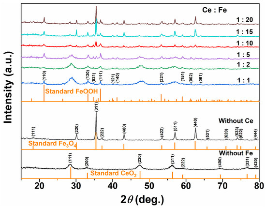 XRD patterns of samples synthesized with different molar ratios of Ce:Fe (1:1, 1:2, 1:5, 1:10, 1:15 and 1:20), and two reference samples synthesized without Fe and without Ce.