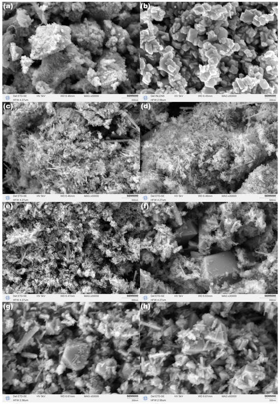 SEM analysis was conducted to clarify the morphology of samples synthesized with different molar ratios of Ce:Fe. Figure 2a,b shows the SEM images of two reference samples, namely CeO2 and Fe3O4, respectively. For the sample synthesized without Fe, the resulting cubic CeO2 product in Figure 2a exhibited a sheet-like structure, with nanoparticles and a micron-scale aggregate composed of coexisting fibers. For the sample synthesized without Ce, the as-obtained cubic Fe3O4 product was found to be irregular polyhedron crystals with diameters of about 50–200 nm; see Figure 2b. Figure 2c–h shows the SEM images of Fe3O4/FeOOH/CeO2 composites synthesized with different Ce:Fe molar ratios of 1:1, 1:2, 1:5, 1:10, 1:15 and 1:20, respectively. It was found that the molar ratio of Ce:Fe was an important factor that affected the morphology of Fe3O4/FeOOH/CeO2 products. With an increase in the molar ratio of Ce:Fe, polyhedral structures began to appear within many rod-like structures, and the number of polyhedra continued to increase.